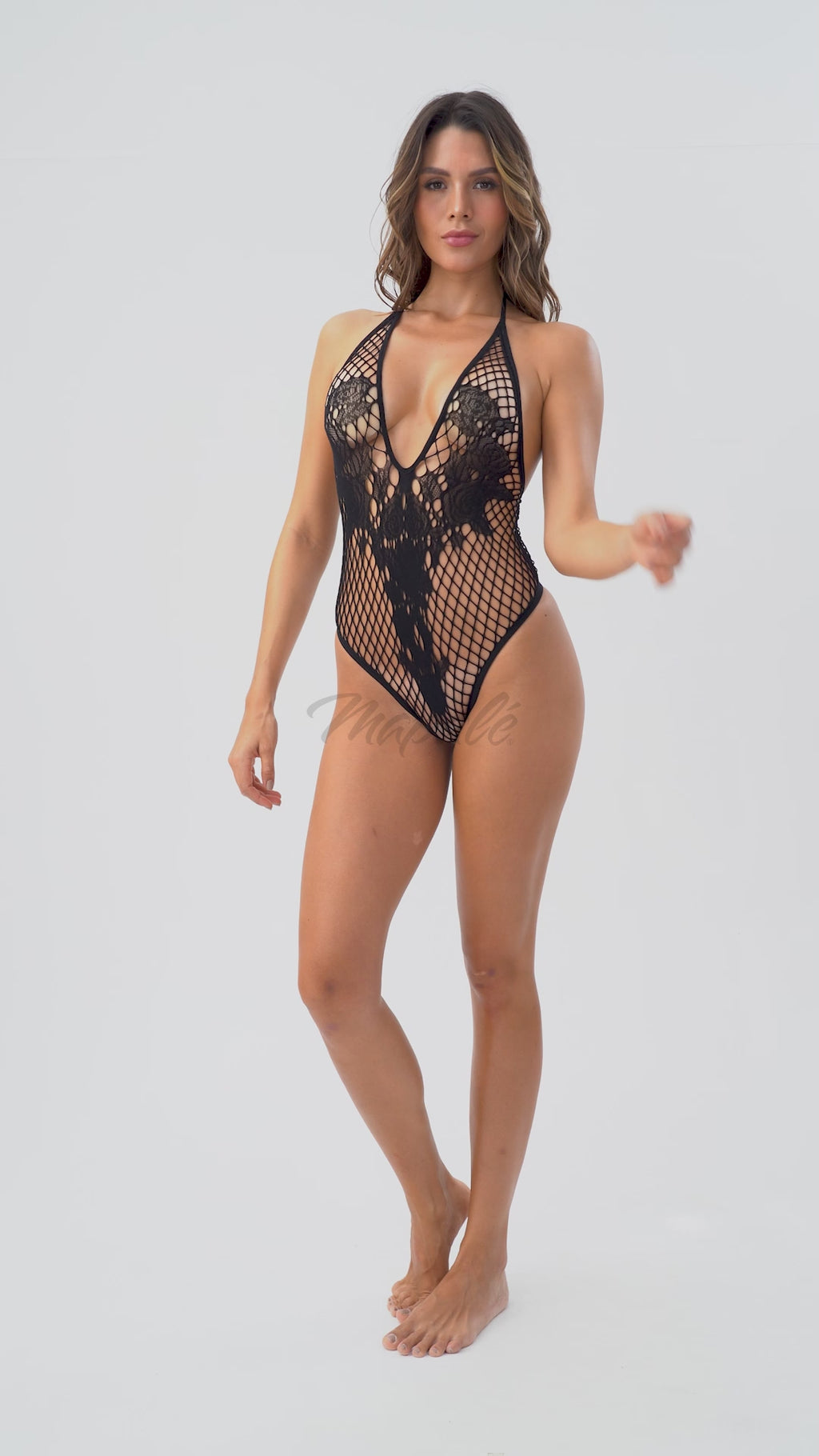 De combinatie van visnet, bloemenprint en strikdetails maakt deze Mapalé body perfect voor wie houdt van lingerie die niet schreeuwt, maar fluistert… en ondertussen alles belooft.