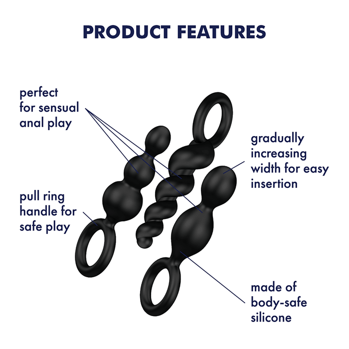 De oplopende diameters van de plugs maken ze ideaal voor anale training. Begin klein, raak vertrouwd met de sensaties en werk langzaam toe naar een intensere vulling. Gebruik altijd een goed glijmiddel op waterbasis, zoals de speciaal ontwikkelde Satisfyer-lijn, om het spel soepel en aangenaam te maken.