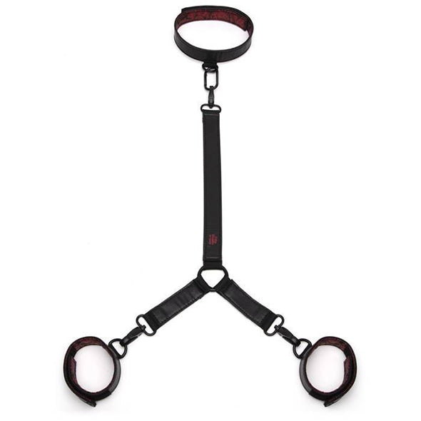 Het setje bestaat uit een verstelbare halsband en bijpassende handboeien, verbonden door een stevige metalen ketting. Het unieke omkeerbare ontwerp biedt twee verleidelijke looks: een elegant zwart aan de ene kant en een sensueel rood met rozenmotief aan de andere kant. Hierdoor kun je de sfeer perfect aanpassen aan jullie stemming.