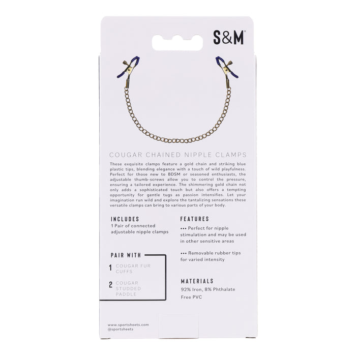 Met de Sportsheets Cougar Tepelklemmen voeg je een roofdierachtige spanning toe aan jullie spel. De luxe, goudkleurige ketting met blauwe accenten glinstert verleidelijk over je huid, terwijl de klemmen je tepels precies die prikkelende druk geven waar je van gaat sidderen. Een sensuele mix van elegantie en rauwe, zinderende opwinding.